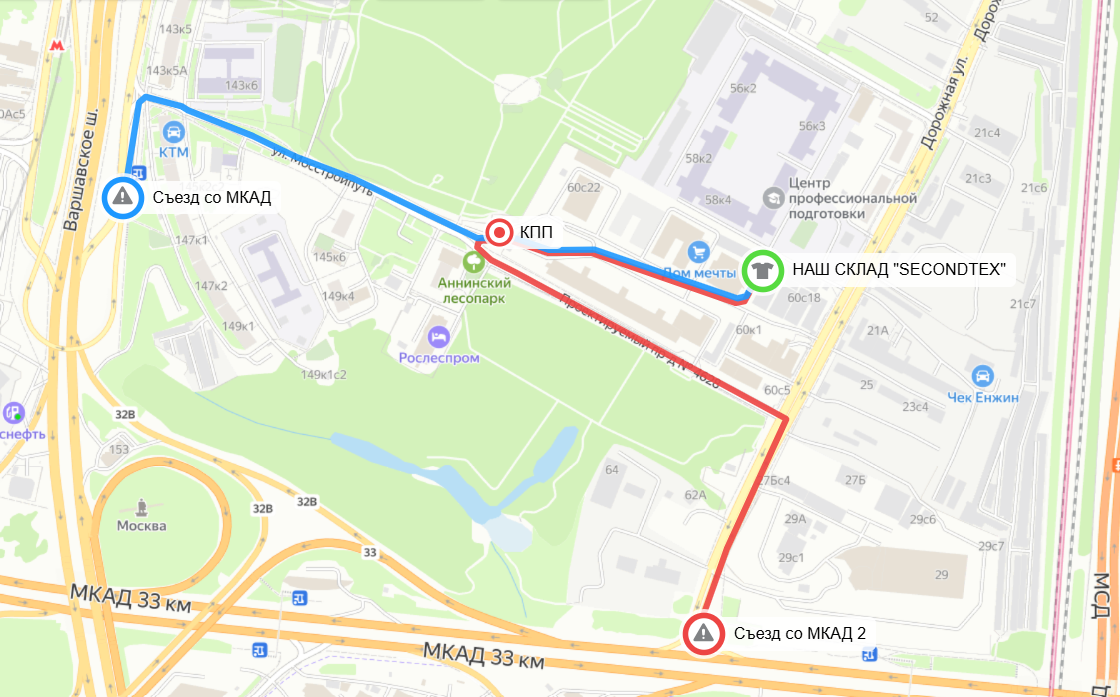 Как добраться ПЕШКОМ: Серпуховско-Тимирязевская линия, станция метро Аннино, последний вагон из центра, 4 выход. Вход в "АННИНО ПЛАЗА" через КПП (точка "1" на карте). На входе необходимо оформить пропуск в компанию "Секонд Хенд".